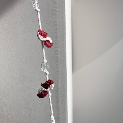 本体表:スパンコール(ゼラチン、ベークライト等)、ビーズ(ガラス等)、シルク